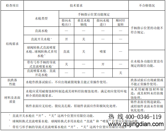 6.11.1.2.1 目測檢查消防水槍各操縱機構(gòu)動作及限位的情況、指示標(biāo)記、材料及表面質(zhì)量。直流噴霧水槍﹑直流開花水槍,其調(diào)節(jié)噴霧角和開花角的旋轉(zhuǎn)開關(guān)的旋轉(zhuǎn)方向可從水槍的進水口觀察。